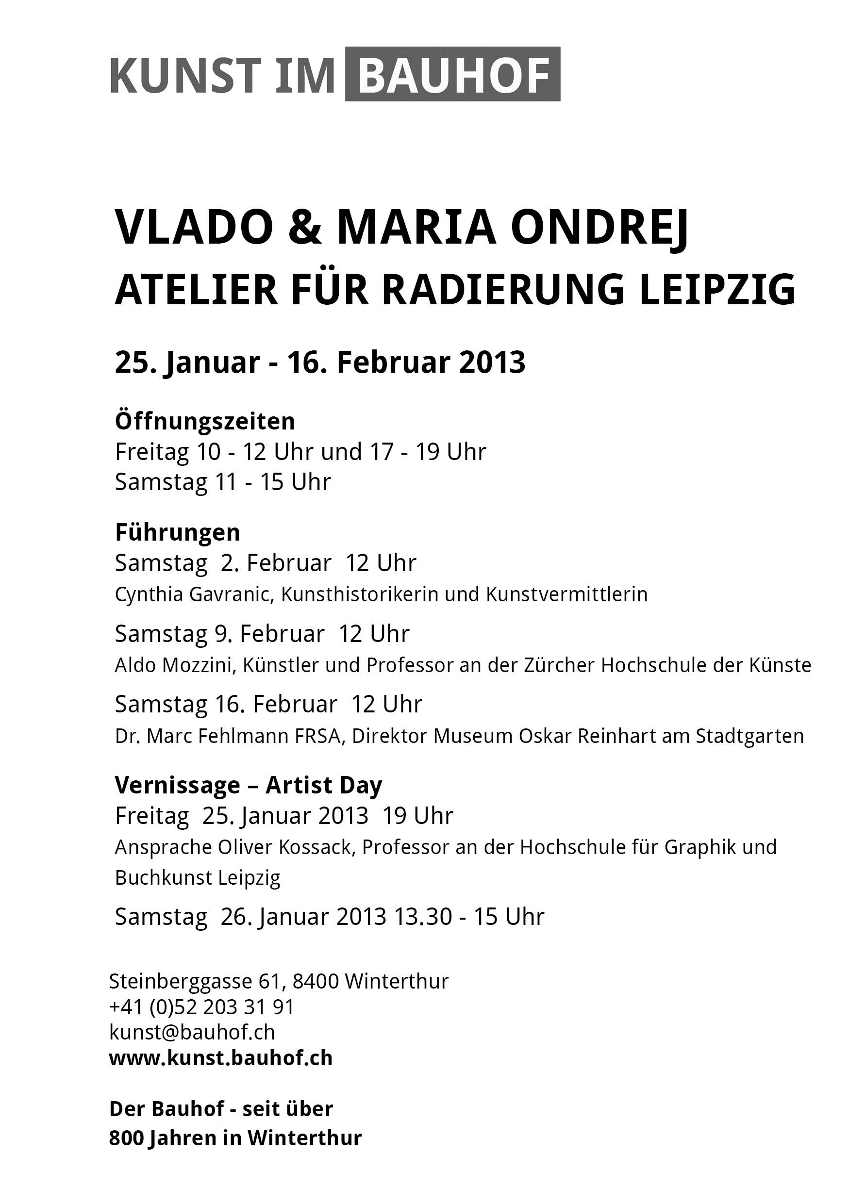 On occasion of the opening in September 2013 Vlado & Maria Ondrej - Atelier für Radierung Leipzig will publish their 7th graphic edition “Cliché verre reloaded – Ein Angriff auf die Zeit“ with an edition of 12 graphic boxes. The box includes 15 original hand made copy prints, signed and numbered by the artists. The edition is accompanied by an essay by Karoline Mueller-Stahl.